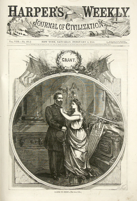 image features Union flags, and a wreath with the name "Grant" inscribed