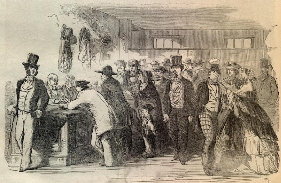 JANUARY 18, 1862.] HARPER'S WEEKLY. 39 THE ARMY ON THE POTOMAC—BRINGING IN REBEL PRISONERS.—[SKETCHED BY OUR SPECIAL ARTIST.](Previous Page) a Congress of Confederate States. In the centre of the Square is the beautiful equestrian statue of Washington, looking as calm and serene and commanding as if the city which he overlooks was not the centre and hot-bed of the foulest treason that ever showed itself in the light of day. The pedestal is designed for eight other statues of distinguished Virginians, but three of which have yet been put in their places. These are Jefferson, Henry, and Mason—not the arrogant, self-conceited blockhead who recently represented the State in the Senate at Washington, and has now gone seeking recognition at London as the diplomatic representative of secessiondom, but a far purer, wiser, and more patriotic namesake of his. Here also is a small statue of Henry Clay. Richmond has really but one business thoroughfare. That is Main Street. Most of the hotels, banks, newspaper offices, and stores are located on it. It extends northward into the open country, and southeastward to a suburb called Rocketts. In this latter section of it are situated some of the tobacco warehouses where our Union prisoners are now confined. These are large old brick edifices, of mouldy, dilapidated appearance. They stand three together on one side of the street—which here is of a most dingy character—and two nearly opposite. Those on the north side are overlooked by the bluffs in which Church Hill here terminates, and which supply gravel for the city, while those on the south side of the street have the James River and Kanawha Canal, and the river itself immediately in their rear. Near the summit of the elevation known as Church Hill is a large, old-fashioned brick building known as the alms-house. It has been converted from its original purpose, and now serves as a hospital for our sick and wounded. Sisters of Charity come and go, untiring angels of consolation, and the hearse is kept in constant requisition, so great is the mortality that prevails here. Many of the private houses in the vicinity are also converted into temporary hospitals. As a general thing, the former residents of this part of the city have gone elsewhere since the location of the hospitals here; and now on every tenth house .or more you see waving a little dirty, whitish-yellow flag, denoting a lazaretto. The Odd Fellows' Hall, on Broad Street, is also used as a general hospital. On the most commanding part of Church Hill still stands, in good preservation too, the church in which Patrick Henry made the famous speech at the commencement of the Revolutionary struggle, where he used that memorable and oft-quoted phrase, "Give me liberty, or give me death!" Around the church are the graves of the last generation of the people of Richmond, and I was no little disgusted to observe that few of the head-stones had escaped the profane Vandalism of some scoundrels, who, as a proof of their wit, cut the figure " 1" before the figures recording the ages of the deceased, making it appear that those who rested here from their labors had enjoyed incredibly patriarchal length of years. Between this hill and the rickety suburb known as Rocketts there is a large encampment, and I believe there are also batteries here, for the defense of the river. I know that there certainly are batteries on the bluffs, above and beyond Rocketts. Near here the few steamers and sailing craft that used to trade to Richmond had their mooring-places, and here also the James River and Kanawha Canal has its southern outlet into the river. This is a great work of internal improvement, so far as the design is concerned; but, unfortunately for Virginia, her execution does not keep pace with her plans, and the canal, though open for many years, does not come within a long distance of the Kanawha River, which it was intended to tap. If it ever will do so, it must be after secession is crushed and the Union restored. Richmond is not, as seems erroneously to be considered, garrisoned by a large army. There are only camps of instruction maintained here. The recruits are sent for drill and equipment, and when they are considered tolerable in those respects they are forwarded to other points. APPLYING FOR PASSES AT THE OFFICE OF THE PROVOST MARSHAL AT ST. LOUIS.--[SKETCHED BY MR. ALEXANDER SIMPLOT.]![]() ![]() |